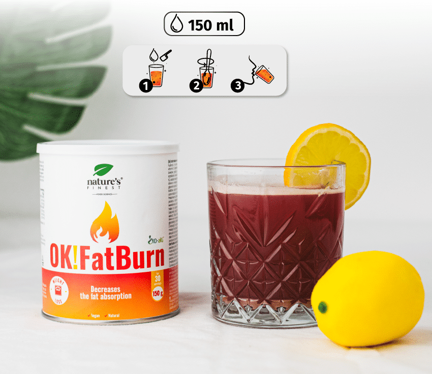 ΠΡΙΝ ΤΟ ΔΕΙΠΝΟ: 5 g (1 μεζούρα) Ok! Fatburn, ανακατέψτε σε 150 ml νερό και πιείτε.