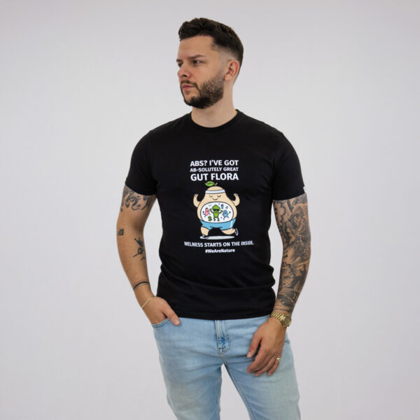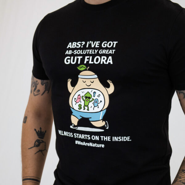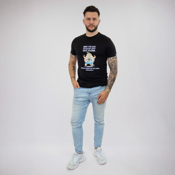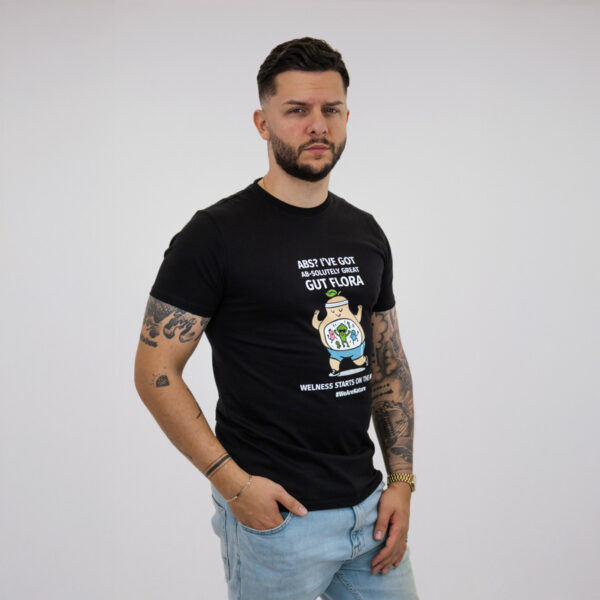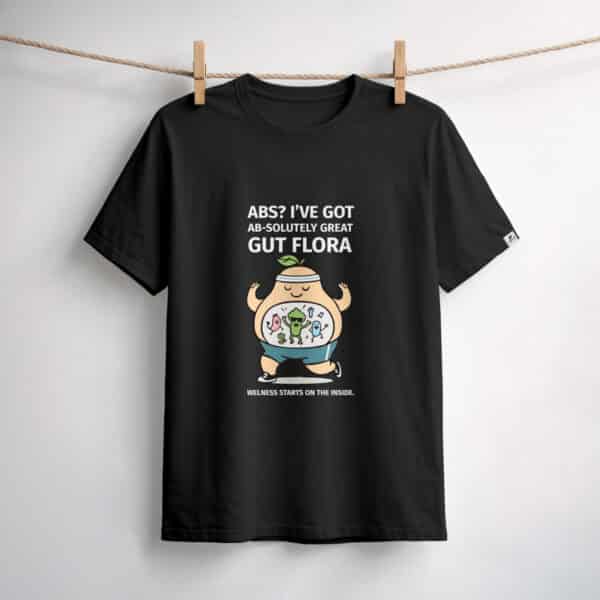 Ένα διασκεδαστικό και έξυπνο μαύρο T-shirt σχεδιασμένο να φέρνει χιούμορ στην καθημερινή σου γκαρνταρόμπα. Με την παιχνιδιάρικη φράση “ABS? I’ve got AB-solutely great GUT FLORA,” είναι μια ανάλαφρη υπενθύμιση ότι η ευεξία ξεκινά από μέσα.