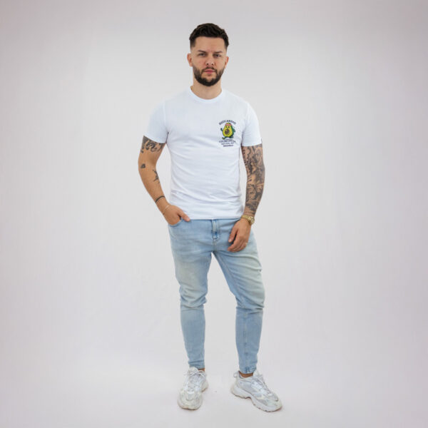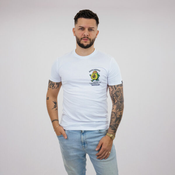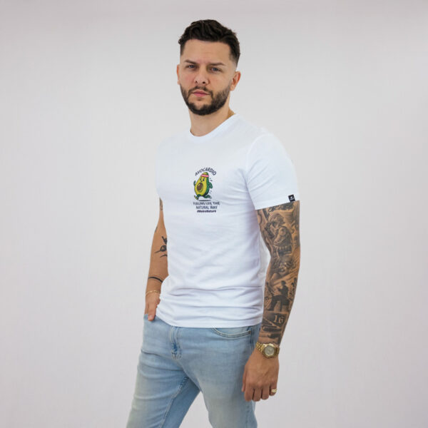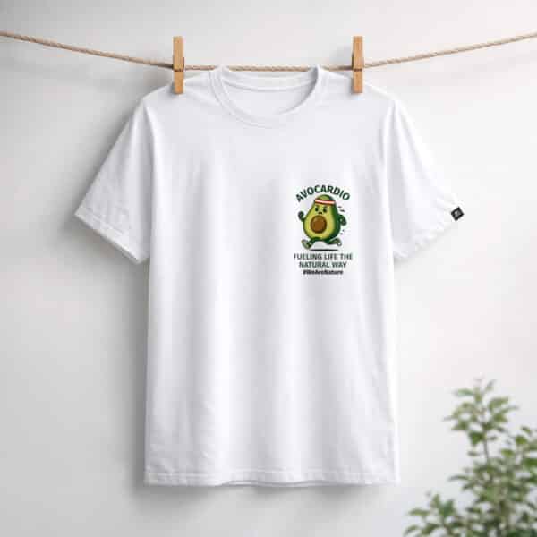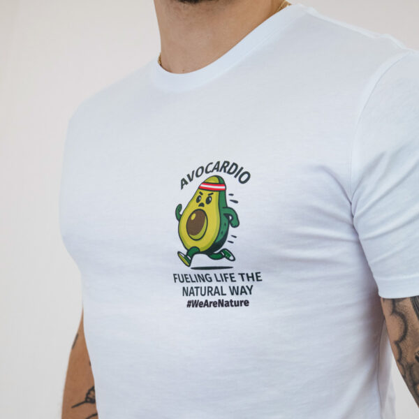 Ένα λευκό T-shirt με μια έντονη εικονογράφηση ενός αβοκάντο που τρέχει και το παιχνιδιάρικο κείμενο “AVOCARDIO.” Με το σύνθημα “ΤΡΟΦΟΔΟΤΩΝΤΑΣ ΤΗ ΖΩΗ ΜΕ ΦΥΣΙΚΟ ΤΡΟΠΟ,” αυτό το μπλουζάκι είναι μια διασκεδαστική και ενθαρρυντική υπενθύμιση να παραμένετε δραστήριοι και να συνεχίζετε να κινείστε.