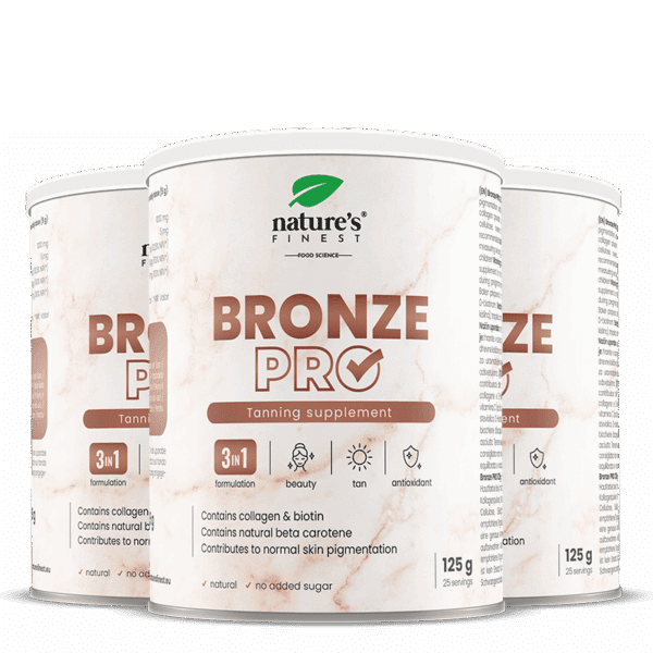 Με το αντιοξειδωτικό μείγμα Bronze PRO, που περιέχει βιταμίνη C και βιταμίνη Ε, μπορείτε να προστατέψετε τα κύτταρα σας από βλάβες, αποτρέποντας τα πρόωρα σημάδια γήρανσης και διατηρώντας τη νεανική όψη του δέρματός σας.