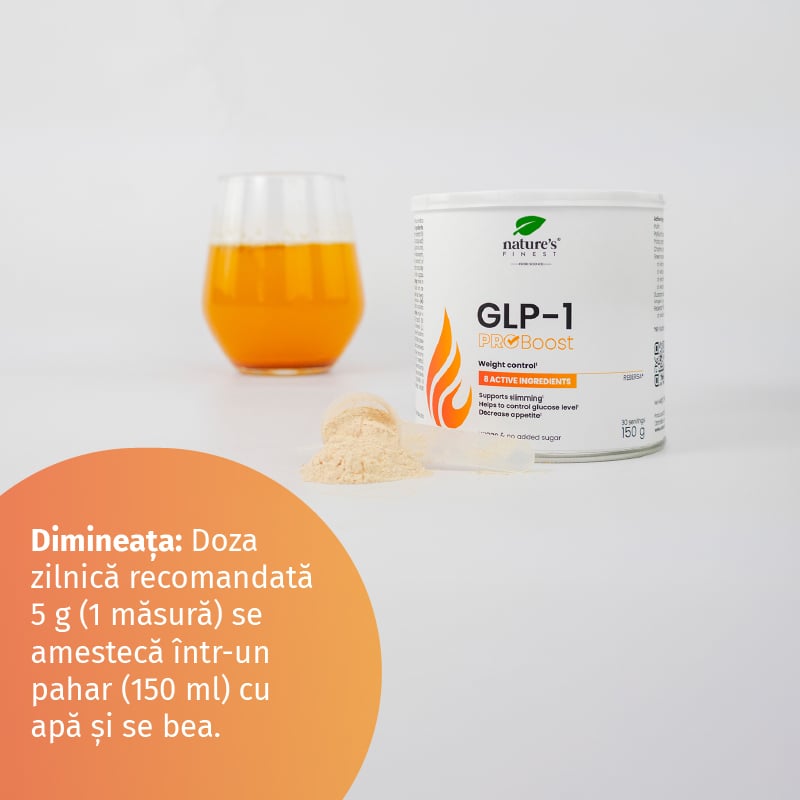 GLP-1 ProBoost: Συνιστώμενη ημερήσια δόση 5g (1 κουταλάκι του γλυκού), αναμίξτε με ένα ποτήρι (150 ml) νερού και πιείτε. Για ακριβή μέτρηση, προτείνουμε τη χρήση ζυγαριάς.