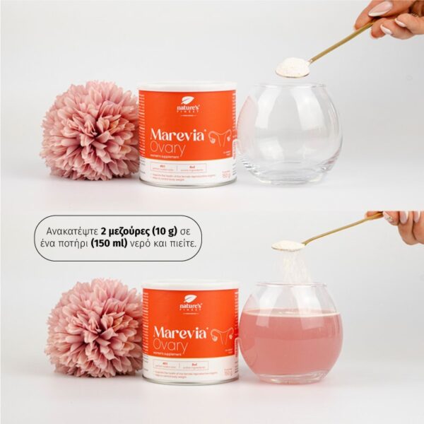 Δύο δοσομετρητές του προϊόντος Marevia Ovary ανακατέψτε σε 150 ml νερού. Ανακατέψτε καλά για να διαλυθεί. Πιείτε μία φορά την ημέρα, το πρωί, το μεσημέρι ή το βράδυ.