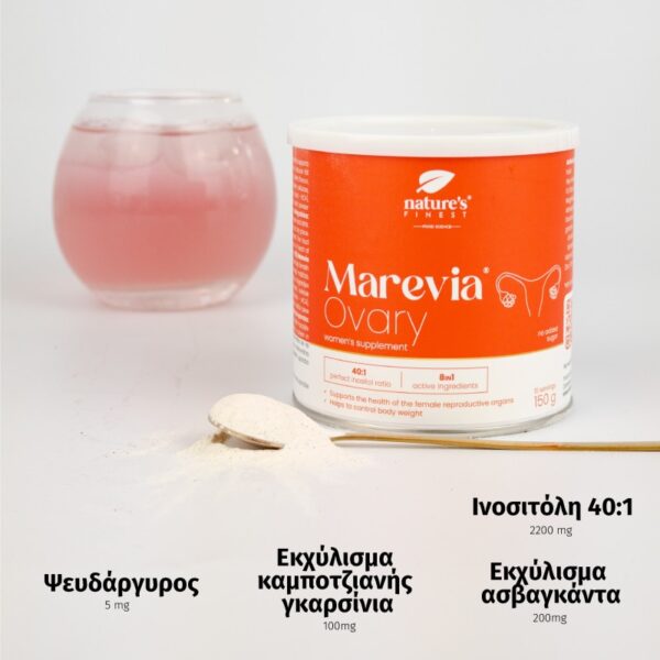 Το Marevia Ovary περιέχει μαγνήσιο, που συμβάλλει στη μείωση της κούρασης και της εξάντλησης, καθώς και ασαβάγαντα, που βελτιώνει την αντοχή του σώματος στο άγχος και βοηθά στη χαλάρωση, στη πνευματική και σωματική ευημερία.