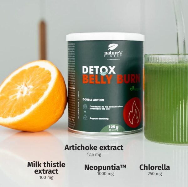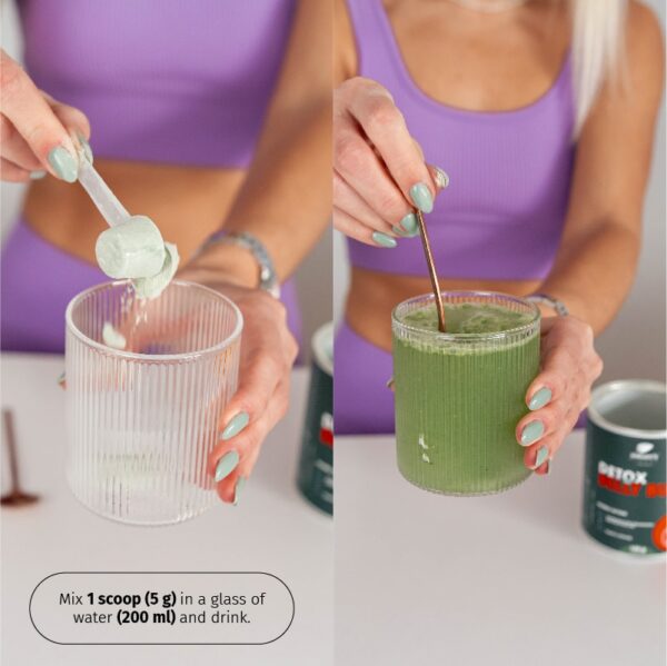 Detox Belly Burn: Ανακατέψτε 1 δοσομετρητή (5 g) σε ένα ποτήρι νερό (200 ml) και πιείτε.