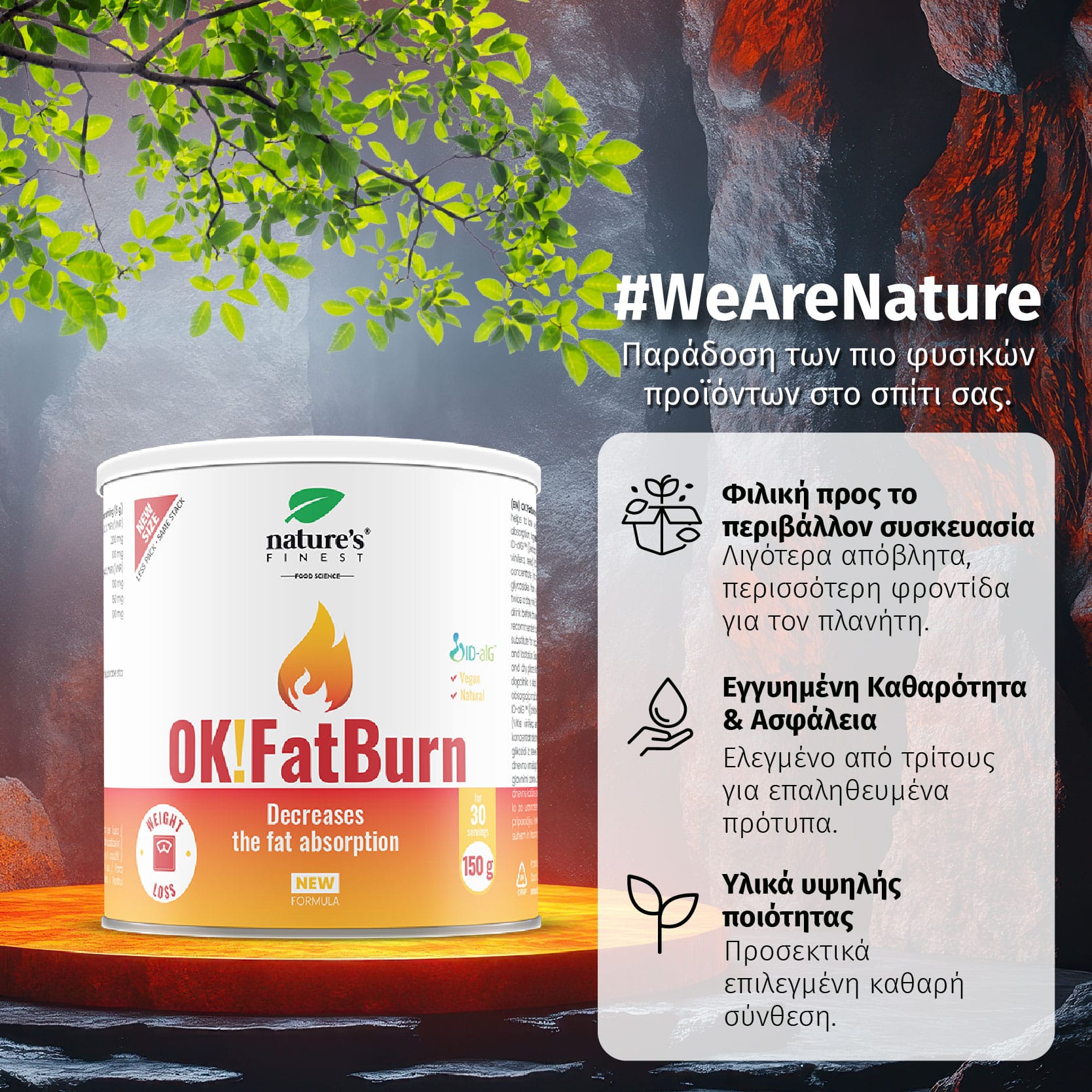 Το OK!Fatburn είναι μια αποτελεσματική φόρμουλα αδυνατίσματος που αναστέλλει τα ένζυμα για την πέψη των υδατανθράκων και των λιπών με τη βοήθεια του ID-alG™. Η τριπλή δράση της φόρμουλας συμβάλλει στον φυσιολογικό μεταβολισμό που παράγει ενέργεια⁴, με την πρόσθετη δύναμη της L-τυροσίνης και της L-καρνιτίνης. Οι μελέτες επιβεβαιώνουν αισθητή απώλεια βάρους που συνδέεται με τη μείωση της λιπώδους μάζας.¹