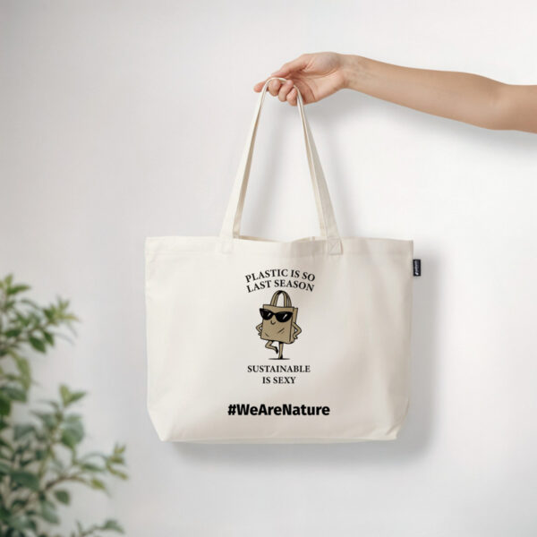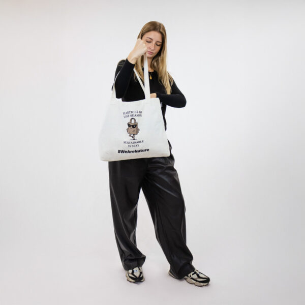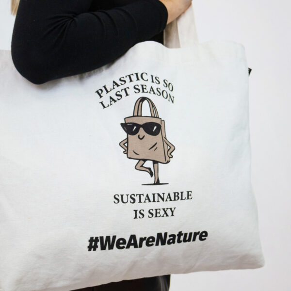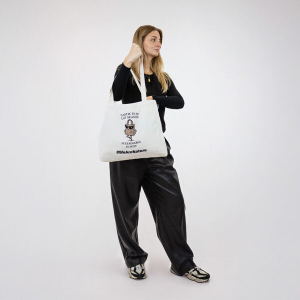 Ένα διαχρονικό tote σχεδιασμένο για καθημερινό στυλ με βιώσιμη προσέγγιση. Τυπωμένο με το παιχνιδιάρικο μήνυμα “Το πλαστικό είναι τόσο περασμένη μόδα. Η βιωσιμότητα είναι σέξι.” και μια γοητευτική εικονογράφηση μιας γεμάτης αυτοπεποίθηση τσάντας αγορών με γυαλιά ηλίου, προσθέτει χιούμορ και χαρακτήρα στη συνειδητή καθημερινότητα.