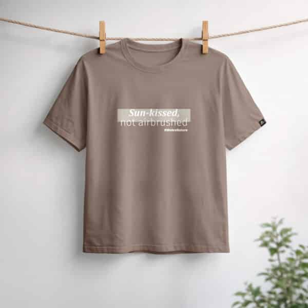 Ένα μινιμαλιστικό ταμπά T-shirt δημιουργημένο για μια καθημερινή εμφάνιση με φυσική αυτοπεποίθηση. Με το διακριτικό μήνυμα “Sun-kissed, not airbrushed” σε απαλή λευκή εκτύπωση, γιορτάζει την αυθεντικότητα και την ανεπιτήδευτη ομορφιά.