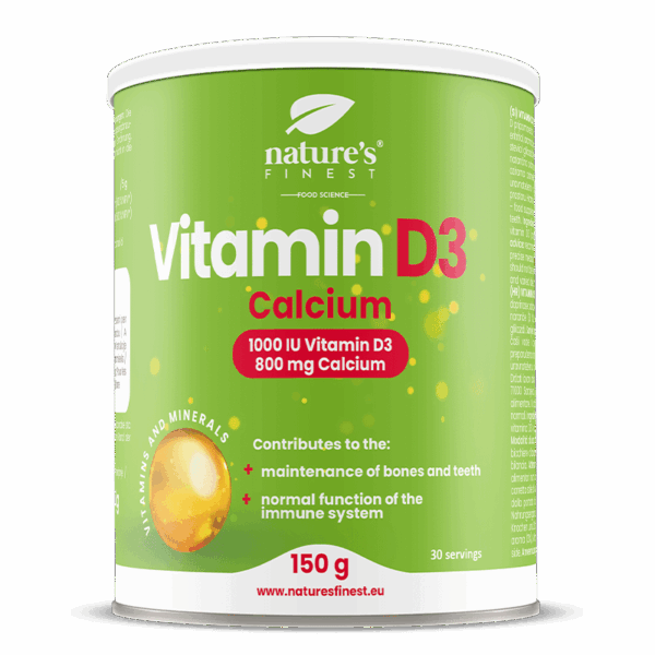 Με αυτή τη σκόνη βιταμίνης D3 και ασβεστίου, εξασφαλίζουμε την καλύτερη απορρόφηση, η οποία αρχίζει μόλις καταναλωθεί. Ο πρωταρχικός ρόλος της βιταμίνης D είναι η διατήρηση της ομοιόστασης και της σταθερής συγκέντρωσης ασβεστίου και φωσφορικών αλάτων στο πλάσμα.