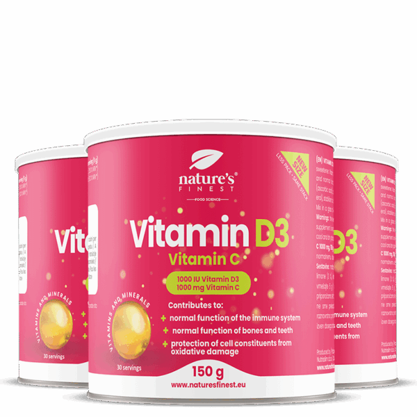 Με αυτή τη σκόνη βιταμίνης D3 και βιταμίνης C, εξασφαλίζουμε την καλύτερη απορρόφηση, η οποία ξεκινά μόλις καταναλωθεί. Ο πρωταρχικός ρόλος της βιταμίνης D είναι η διατήρηση της ομοιόστασης και της σταθερής συγκέντρωσης ασβεστίου και φωσφορικών αλάτων στο πλάσμα, ενώ η βιταμίνη C δρα ως ισχυρό αντιοξειδωτικό.